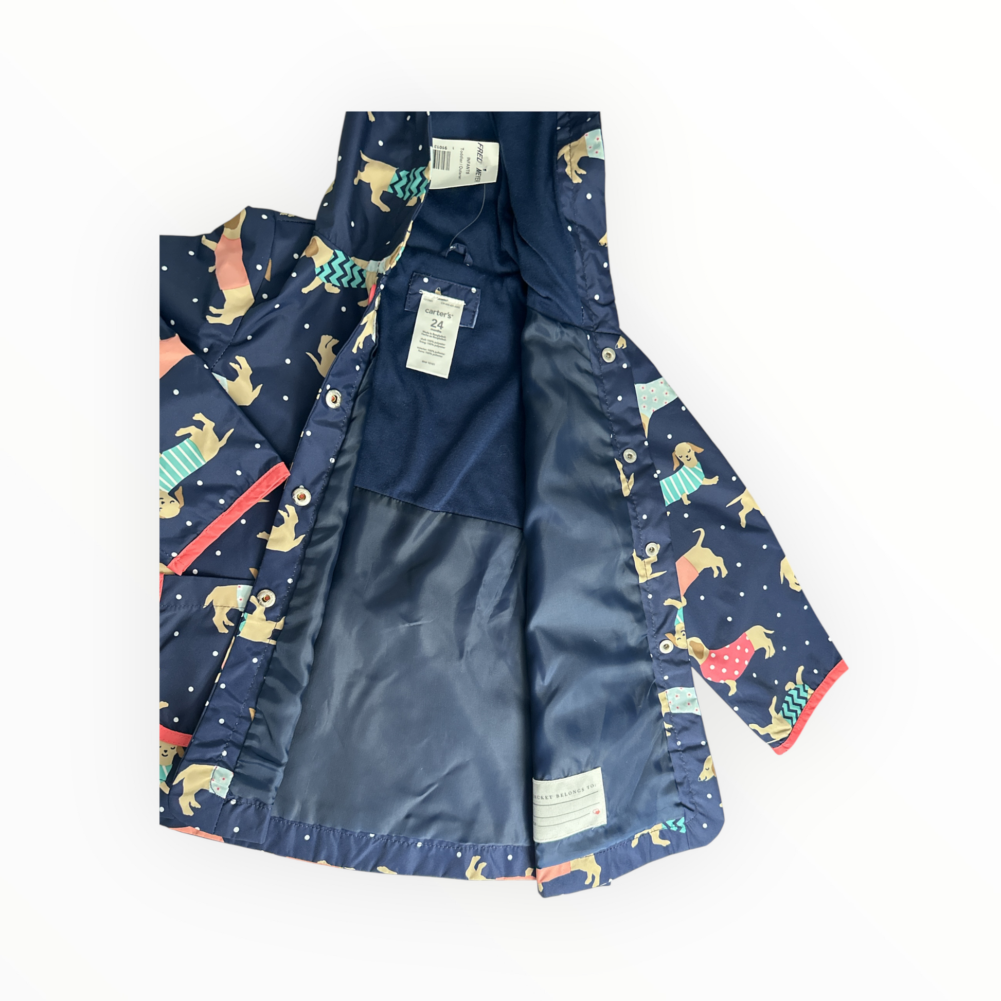 This Carter’s rain jacket for toddlers features a navy-blue base adorned with an adorable dog print and accented by pink snap buttons for easy closure. Designed for a 24-month-old. Adding a playful touch to rainy day outfits, combining quality, comfort, and charm in one practical piece.