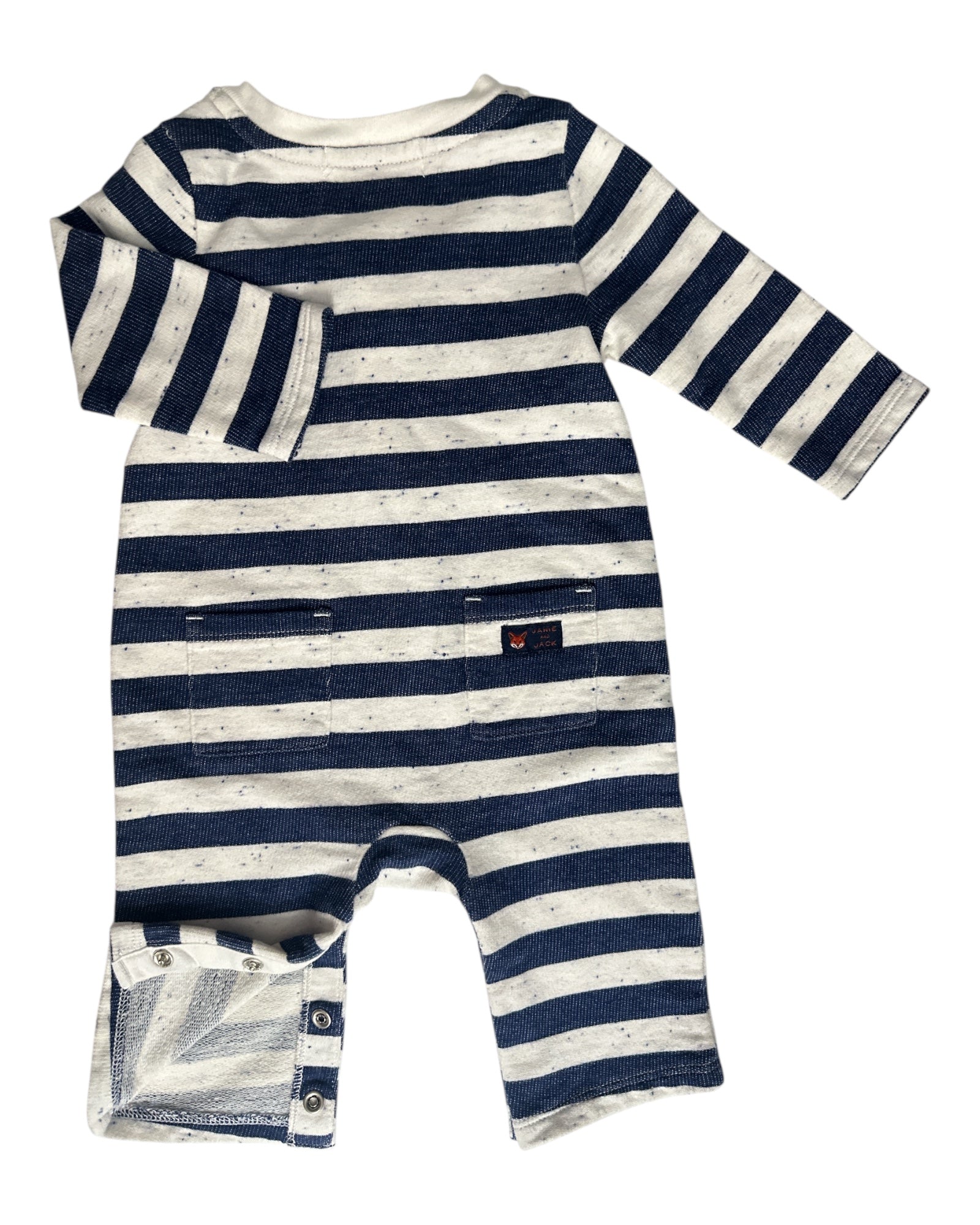 Adorable navy and white striped romper with button-front detail and back pockets. Soft, comfy knit fabric makes it perfect for everyday wear or special outings. Easy snap closures for quick diaper changes.